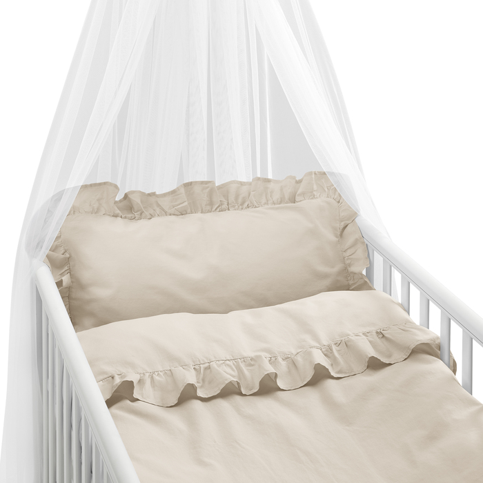 Bäddset tillverkat i fin bomullspercale som känns svalt och skönt att sova i. Örngottet har volanger på tre sidor och påslakanet har en volang på framsidan. Passande storlek för barnvagn eller vagga.
