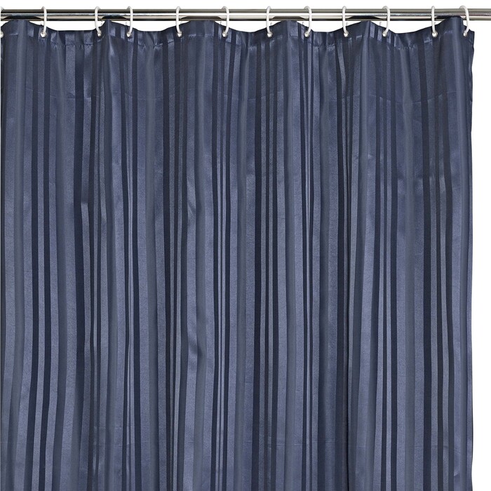 Duschdraperi i polyester med fin lyster och ett klassiskt randigt mönster. Fållade kanter runt om. Hål med metallöljetter upptill. Medföljer 12 transparanta plastkrokar för smidig upphängning.