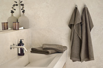 Borganäs Helle frotté är en serie handdukar, badlakan och dushmattor i stilren och modern design som passar i de flesta badrum. Frottén är tillverkad av 100% bomull i en mjuk och skön kvalitet. Handduken i storlek 50x70 cm har två bårder upptill och tre nedtill, samt rundade hängare på båda kortsidor för smidig upphängning.
