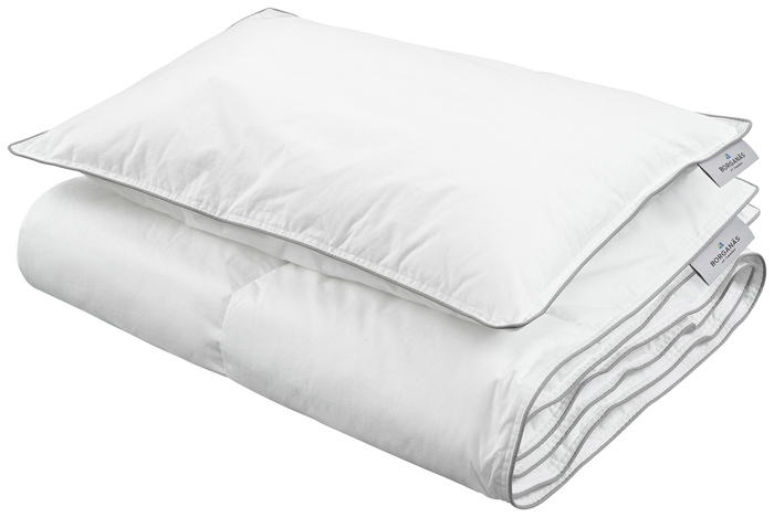 Borganäs setpack innehållande lyxfiberkudde och täcke i passande storlek för spjälsängen. Kudden och täcket är tillverkade av 100% bomull och har en grå passpoal runt om. I Borganäs lyxfiber-serie säljs även setpack i storlek för barnvagn, samt separat packad kudde och täcke.