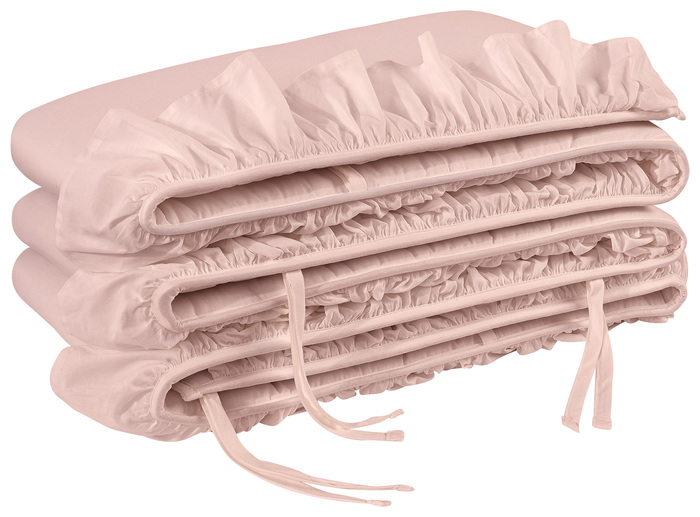 Spjälsängsskydd med fina volanger, tillverkat i 100% bomull, med mjuk vaddering och praktiska knytband som håller skyddet på plats i spjälsängen. Borganäs spjälskydd finns i flera olika färger.